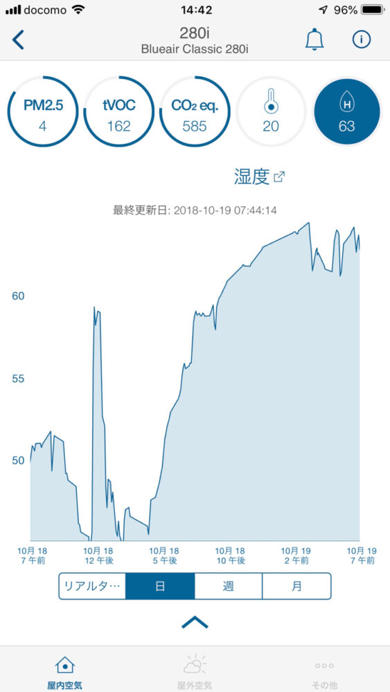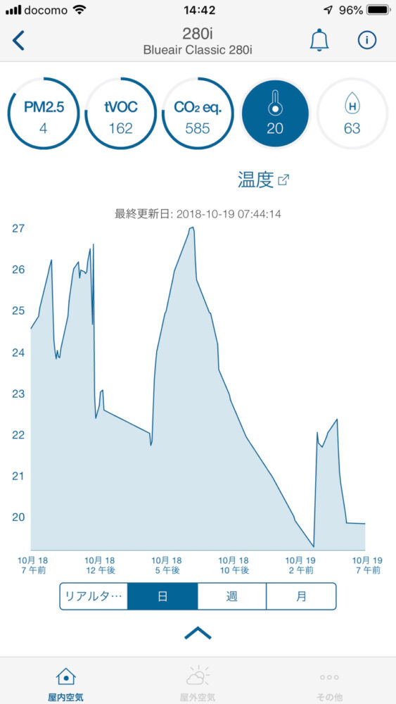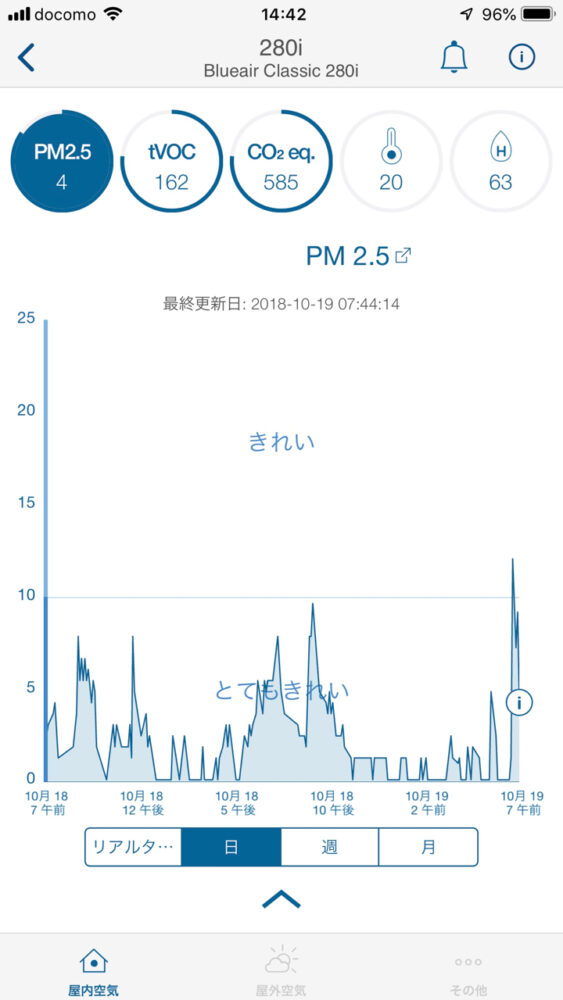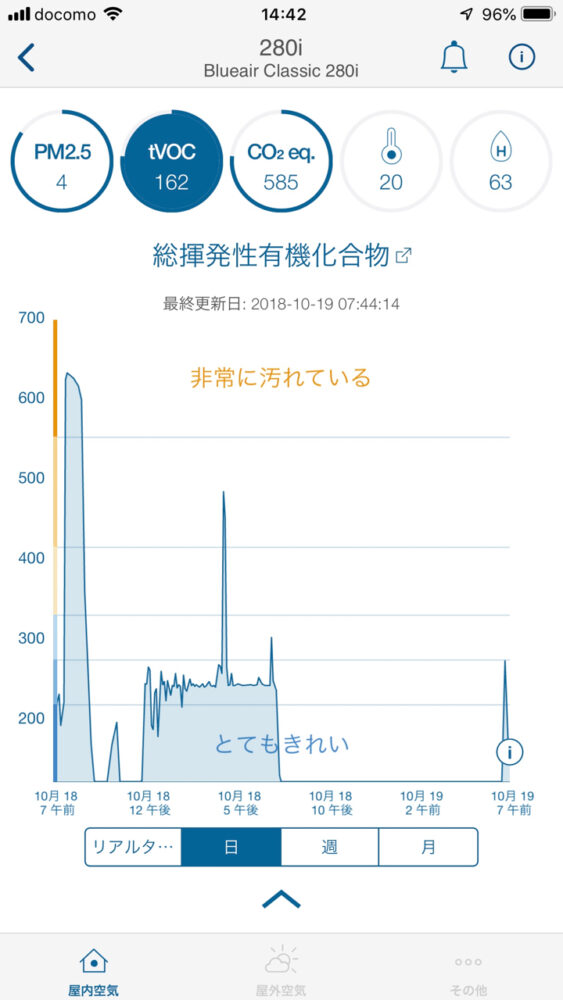 280iなら内蔵の空気センサーが常時監視しているので、そのデーターはiPhoneではグラフで表示されて、空気清浄機を買ってよかったとか思うかもしれないし、そうでなくても視覚的に客観的に部屋の空気の状態を見られるのは面白い。