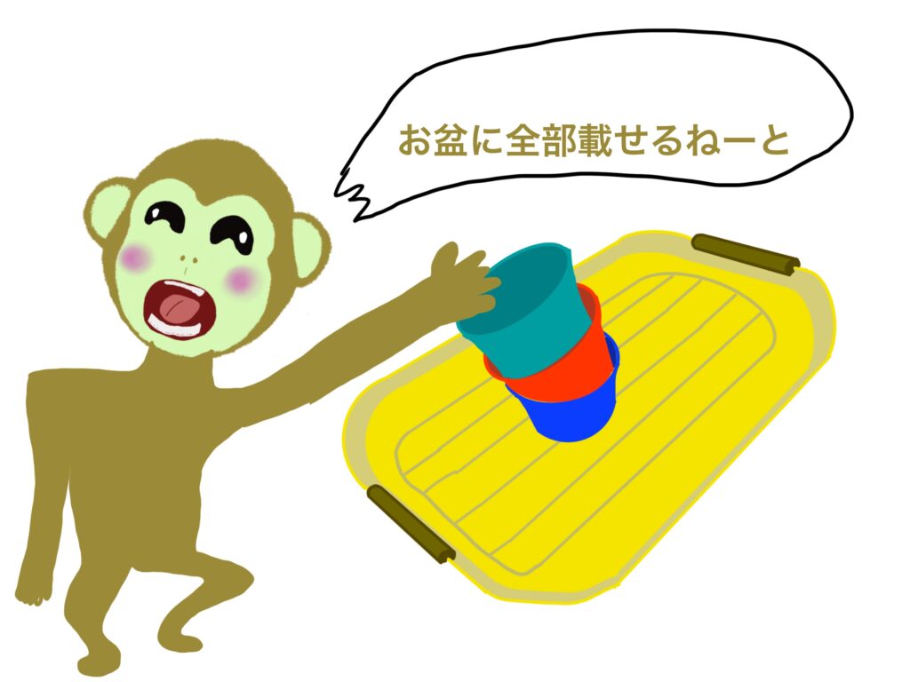 サル(私)は、お盆に食べ終えた食器を得意げに沢山乗せてた。