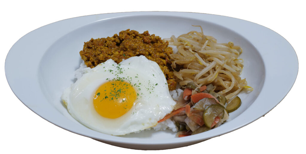 ウサちゃんがスパイス調合したキーマカレーに平飼いの鶏さんの卵と、手作りの福神漬けで最高の朝メシだった!