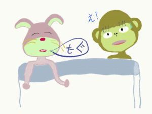 昨夜のこと、隣に寝ている妻が歯ぎしりしているような気がして目が覚めたサルは、歯ぎしりは歯に良くないからウサを起こしてあげたんだ