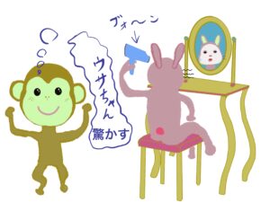 サル、ウサちゃんを発見して、喜んで寄って行った。ついでに驚かせようと思っていた。