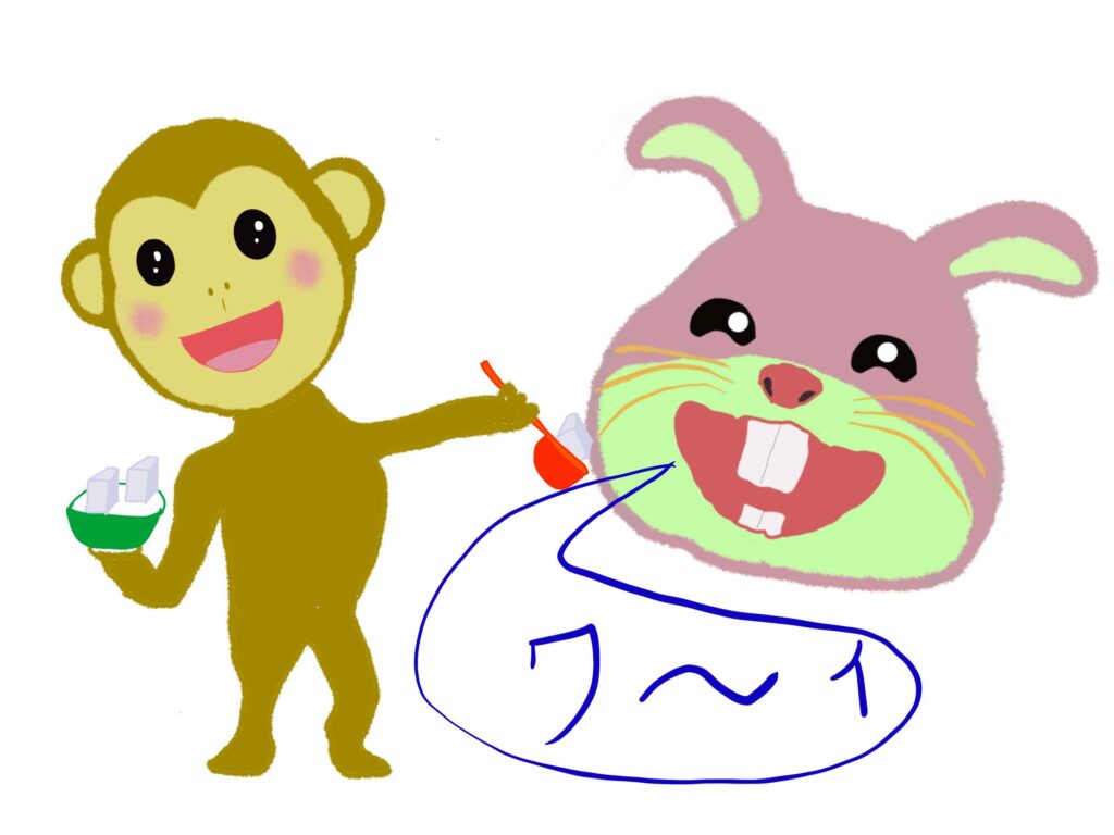 得意げに餌付けするサルだった、大口を開けてる餌付けされるウサ