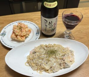 今日の脱グルテンディナーは妻が作ってくれた美味しいクリームパスタと酸化防止剤無添加ワイン。