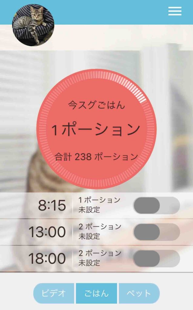 この赤い丸を長尾したら好きなタイミングでエサを出せる。タイマー式にも出来るけど、手動の方が猫とのコミュニケーションにもなるし。普段は手作りご飯だし。