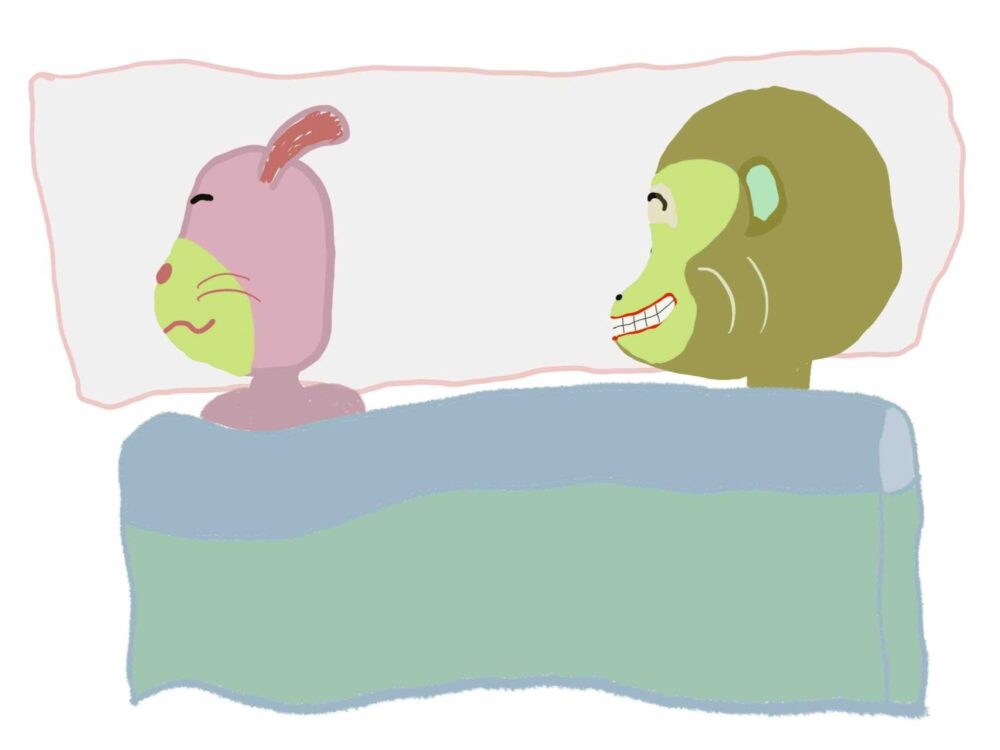 ウサウサがうつ伏せに寝てる事が多いのを不思議に思ったサル
