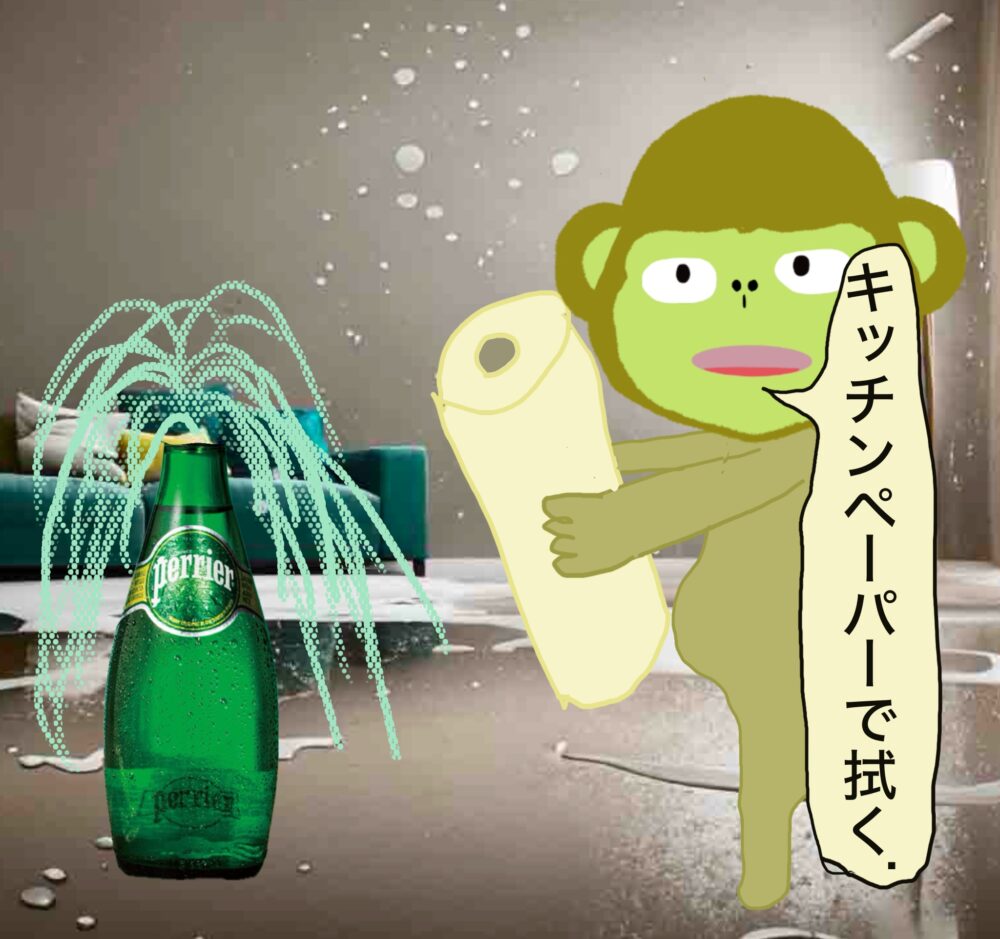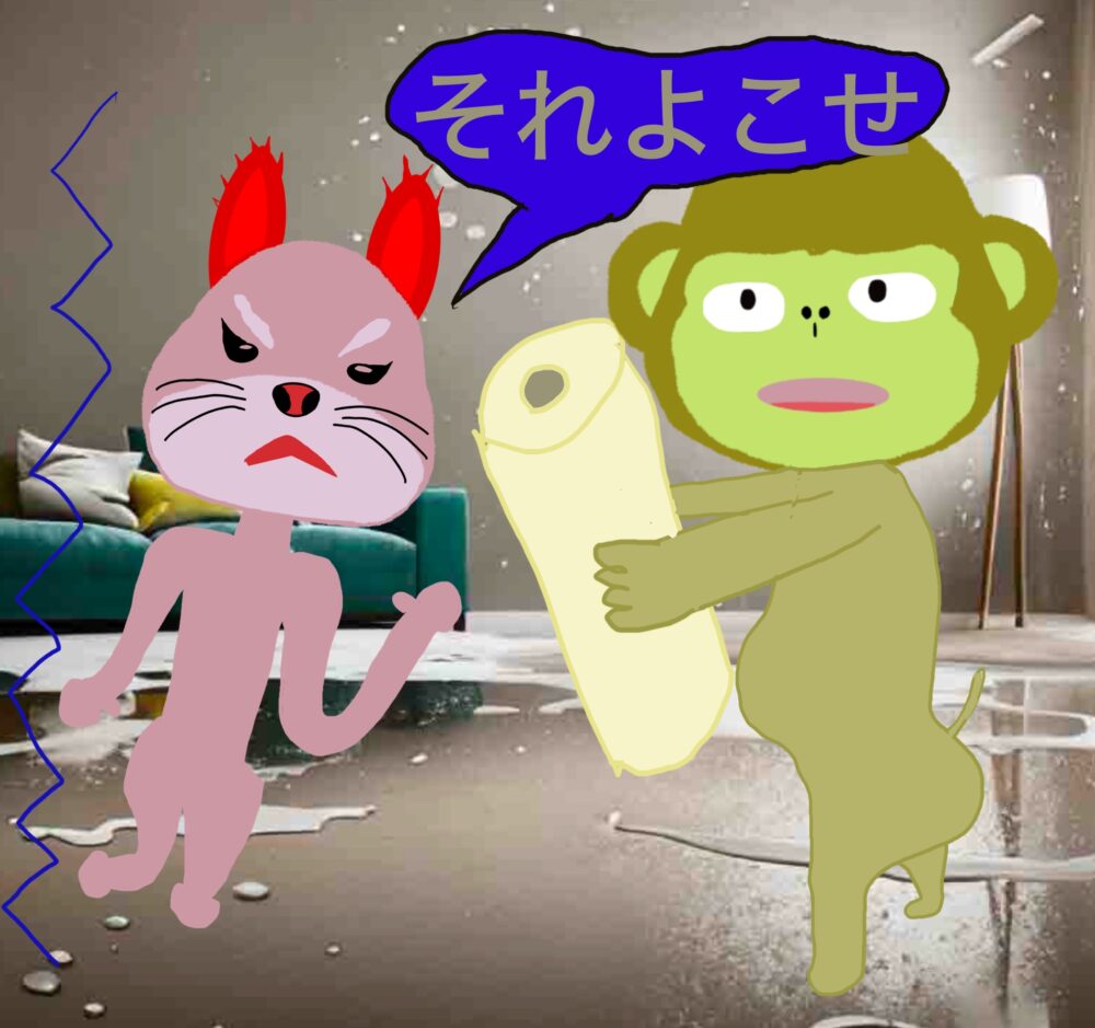 慌てて拭きたいが足が不自由(痛風)なサル