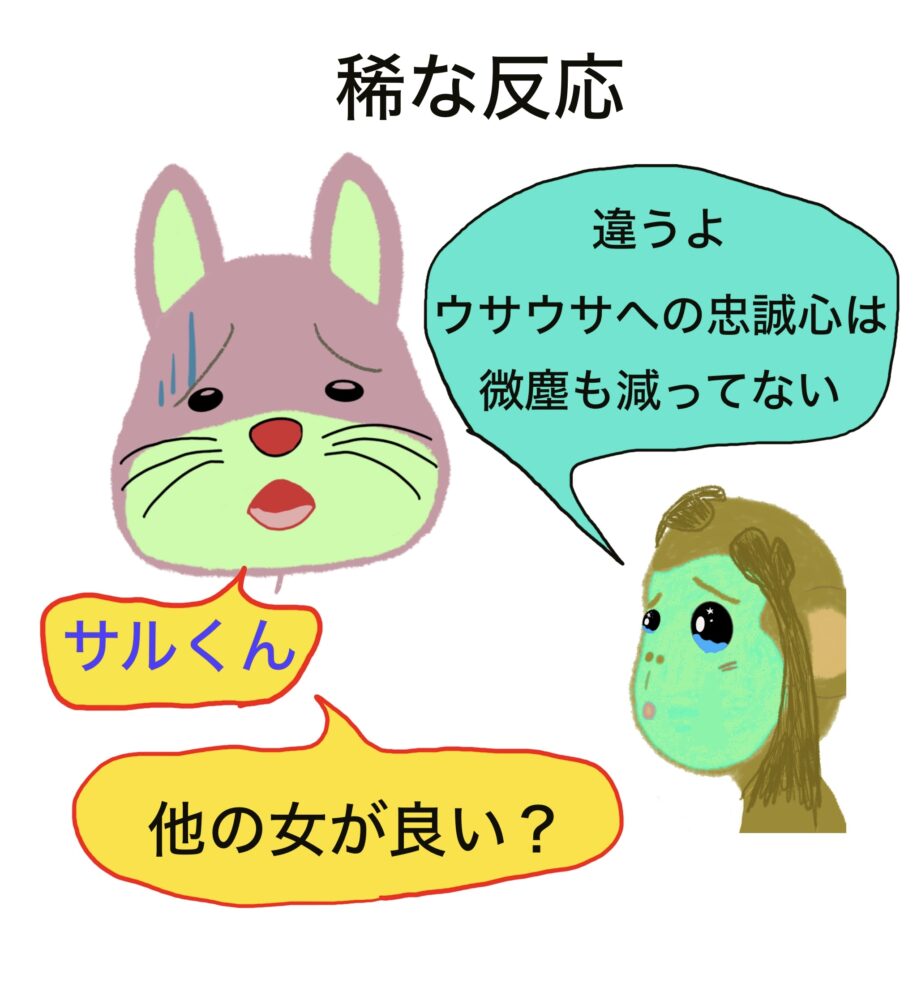 反省するくらいなら、他所の女子なんて見なければ良いし、視界に入っても喜ばなければ良い。それなのに、サルの目と口は勝手に反応してる。本当の本当にウサウサが1番なの。何より大切なのはウサウサなの。これがサルの本心だから信じて欲しい。