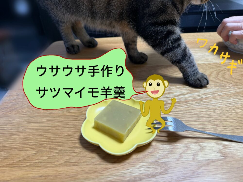 シマキチはワカサギ、サルはウサウサ手作りサツマイモ羊羹だよ。