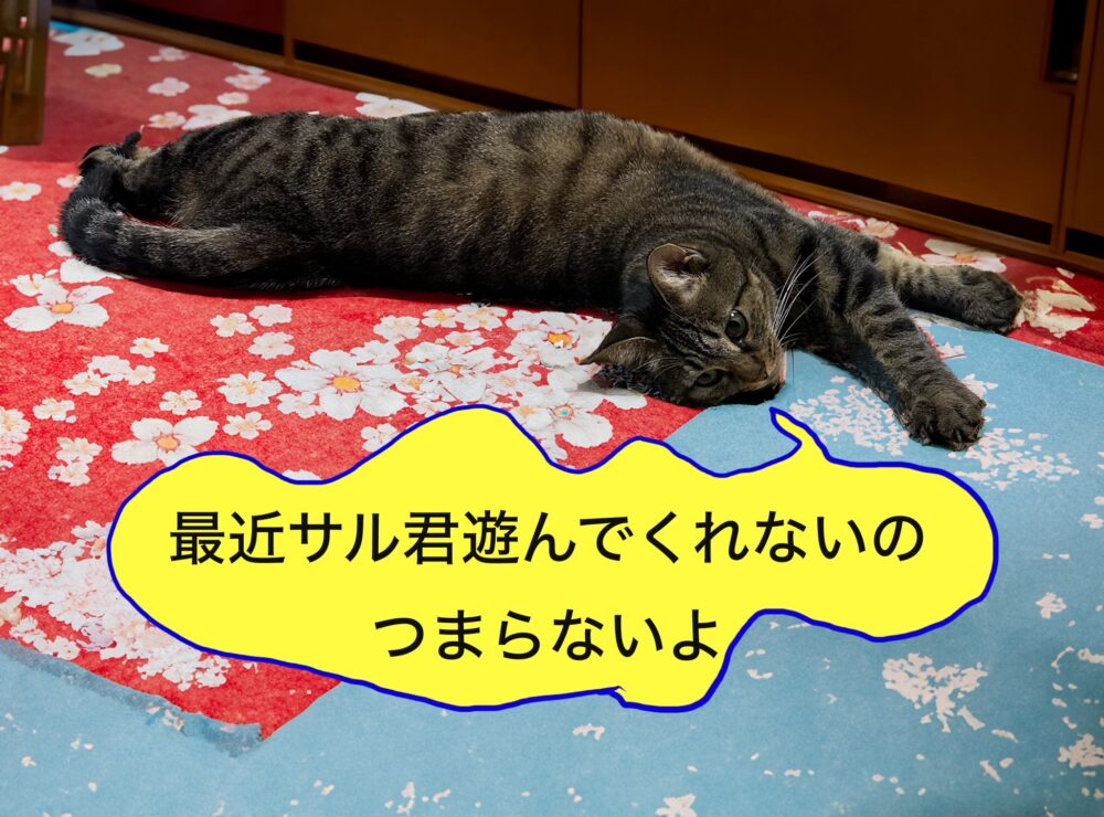 ネコのシマキチはサルの痛風はわからないので遊んでくれないと不満たらたら。 -